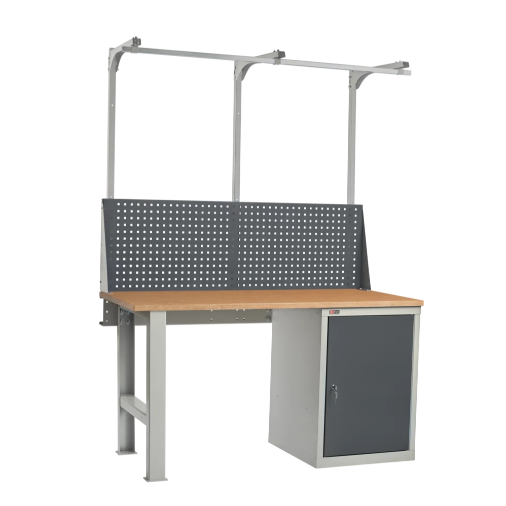 Столешница установлена на опору и инструментальную тумбу ВЛ-010 с двумя полками и распашной дверцей. Тумба закрывается на замок EURO-LOCKS (Германия), секретностью 2000 комбинаций. Верстак укомплектован перфорированным экраном и консолью. На экран с помощью зацепов можно установить аксессуары. На консоль устанавливается освещение или бегунок. Освещение состоит из энергосберегающего светодиодного светильника, который обеспечивает 1200 Lx на рабочей поверхности. Шаг перфорации экрана 35 мм.