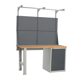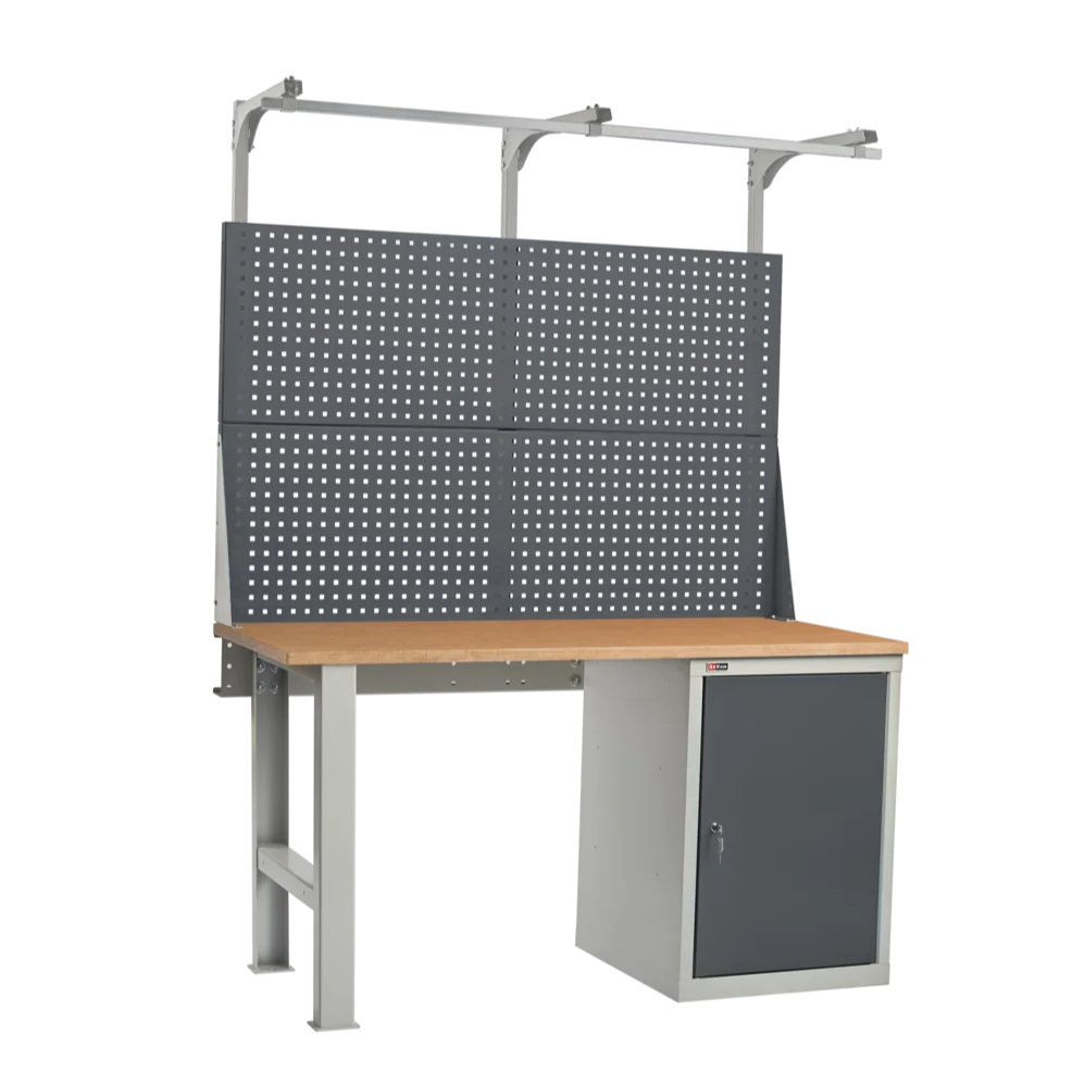 Столешница установлена на опору и инструментальную тумбу ВЛ-010 с двумя полками и распашной дверцей. Тумба закрывается на один замок EURO-LOCKS (Германия), секретностью 2000 комбинаций. Верстак укомплектован перфорированным экраном и консолью. На экран с помощью зацепов можно установить аксессуары. На консоль устанавливается освещение или бегунок. Освещение состоит из энергосберегающего светодиодного светильника, который обеспечивает 1200 Lx на рабочей поверхности. Шаг перфорации экрана 35 мм.