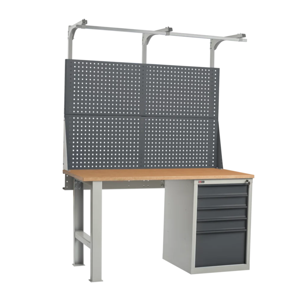 Столешница установлена на опору и инструментальную тумбу ВЛ-015 с 5 выдвижными ящиками. Ящики тумбы закрываются на один общий замок EURO-LOCKS (Германия), секретностью 2000 комбинаций. Верстак укомплектован перфорированным экраном и консолью. На экран с помощью зацепов можно установить аксессуары. На консоль устанавливается освещение или бегунок. Освещение состоит из энергосберегающего светодиодного светильника, который обеспечивает 1200 Lx на рабочей поверхности. Шаг перфорации экрана 35 мм.