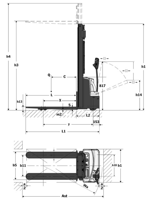 Примечание :Это экономит до 0,5м полезного в стесненных условиях. Наши собственные тесты на складе с расстоянием 1.85м между стеллажами показали возможность эффективной работы данного штабелера в столь узком проходе.