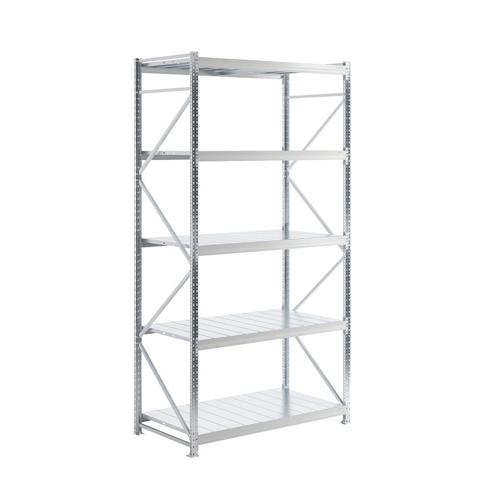Рама и полки стеллажа изготовлены из оцинкованного металла.