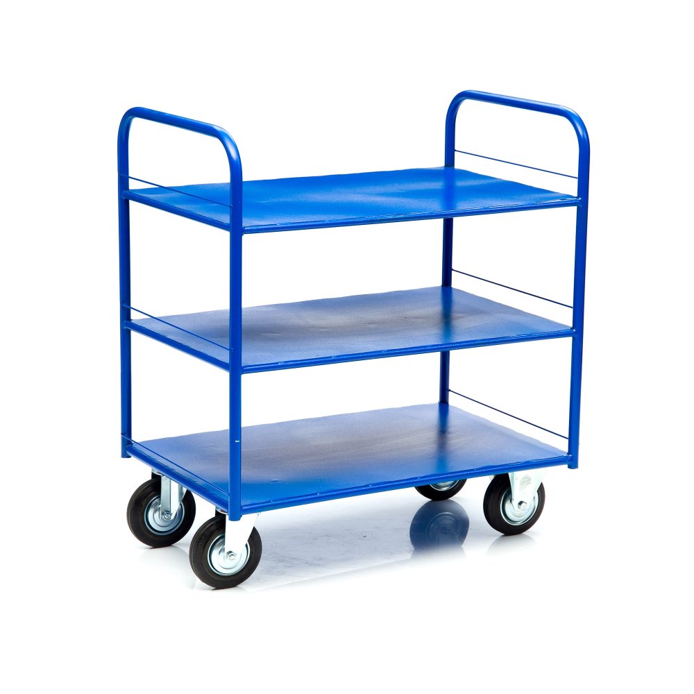 Ручные четырехколесные тележки ТП-3 имеют три сплошные платформы из металла. Ярусы располагаются на расстоянии 300 мм друг над другом.