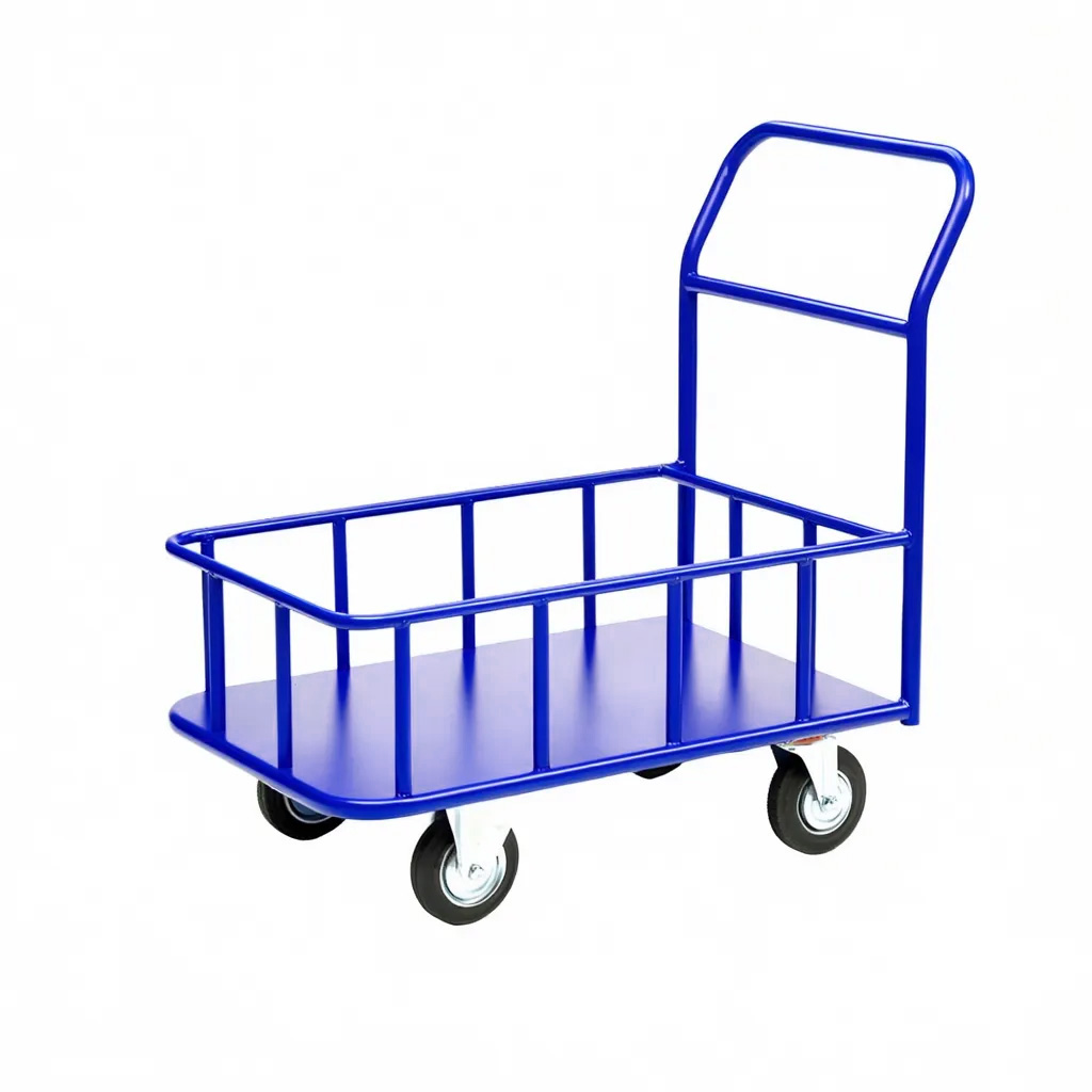 Ручная четырехколесная тележка ТПБ-600х900 имеет сплошную металлическую платформу, окруженную невысоким трубчатым бортом. Высота борта 150 мм. Ручка тележки несъемная.