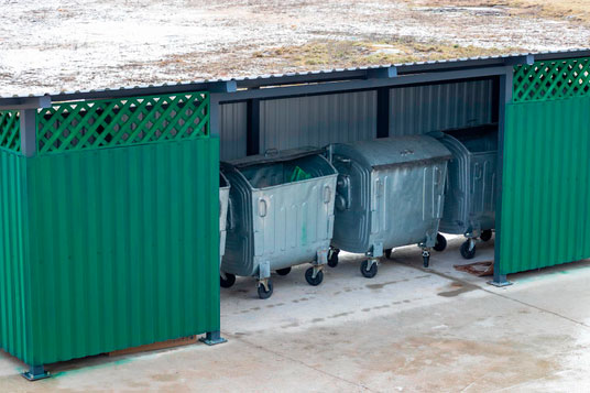 • Закрытые и полуоткрытые типы. Чаще всего используется металлопрофиль или дерево. Закрытая с четырех сторон площадка выглядит эстетичнее и предотвращает доступ животных к отходам.
