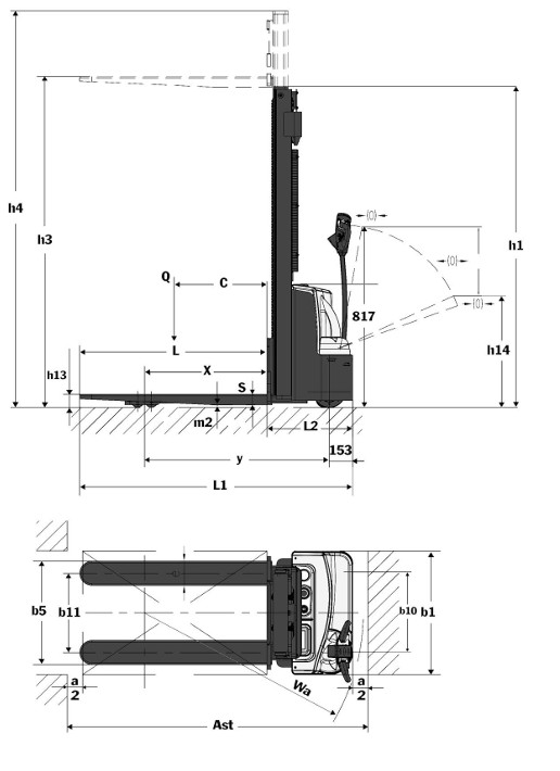 Примечание :Это экономит до 0,5м полезного в стесненных условиях. Наши собственные тесты на складе с расстоянием 1.85м между стеллажами показали возможность эффективной работы данного штабелера в столь узком проходе.